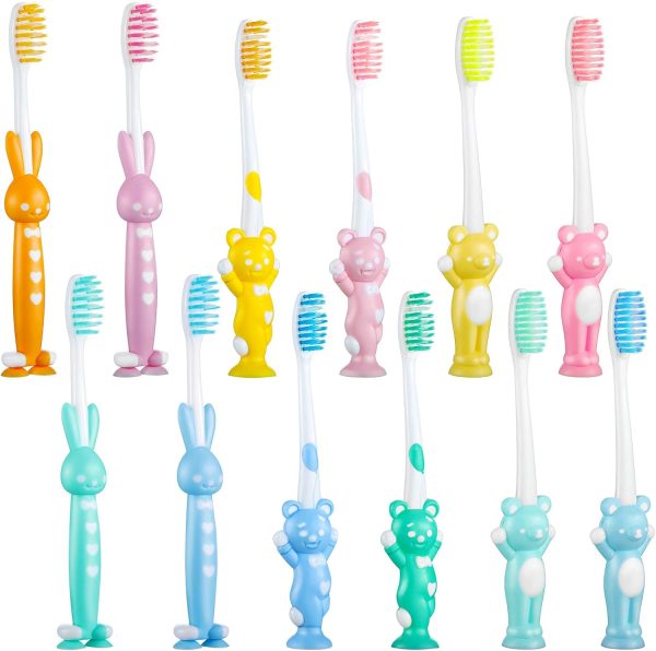 12 Pcs Toddler Toothbrush for Age 2 up, Kids Toothbrush Set with Covers, Soft Children Manual Brushes Bulk with Suction Cup for Upright Storage, Rabbits and Bears Brushes for Travel