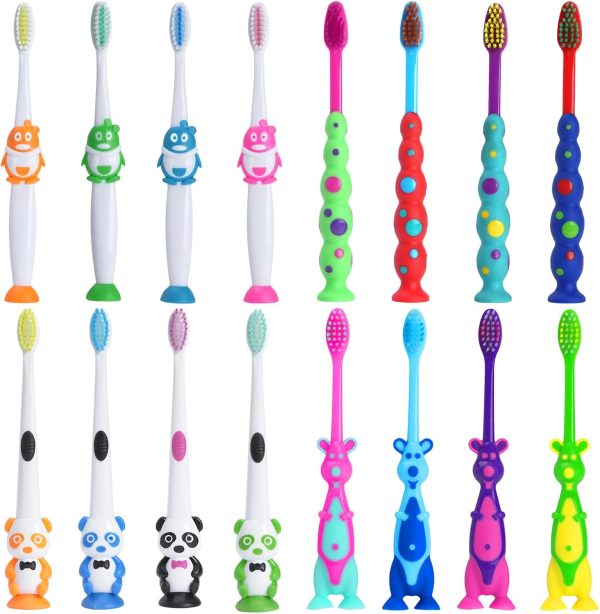 16 Pack Kids Toothbrush Bulk Soft Bristles Toddler Cute Toothbrush with Suction Cup, Includes Travel Covers, Individually Wrapped Toothbrushes, Animal Design for Children’s toothbrushes