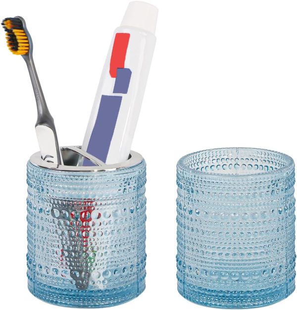 - [ Glass Bathroom Toothbrush Holder Set ] Bathroom toothbrush holder is made of glass,safe for drinking and tooth brushing.toothbrush storage cup with 2 slot,can store toothbrush and toothpaste together,dots design also add tastes the art of life