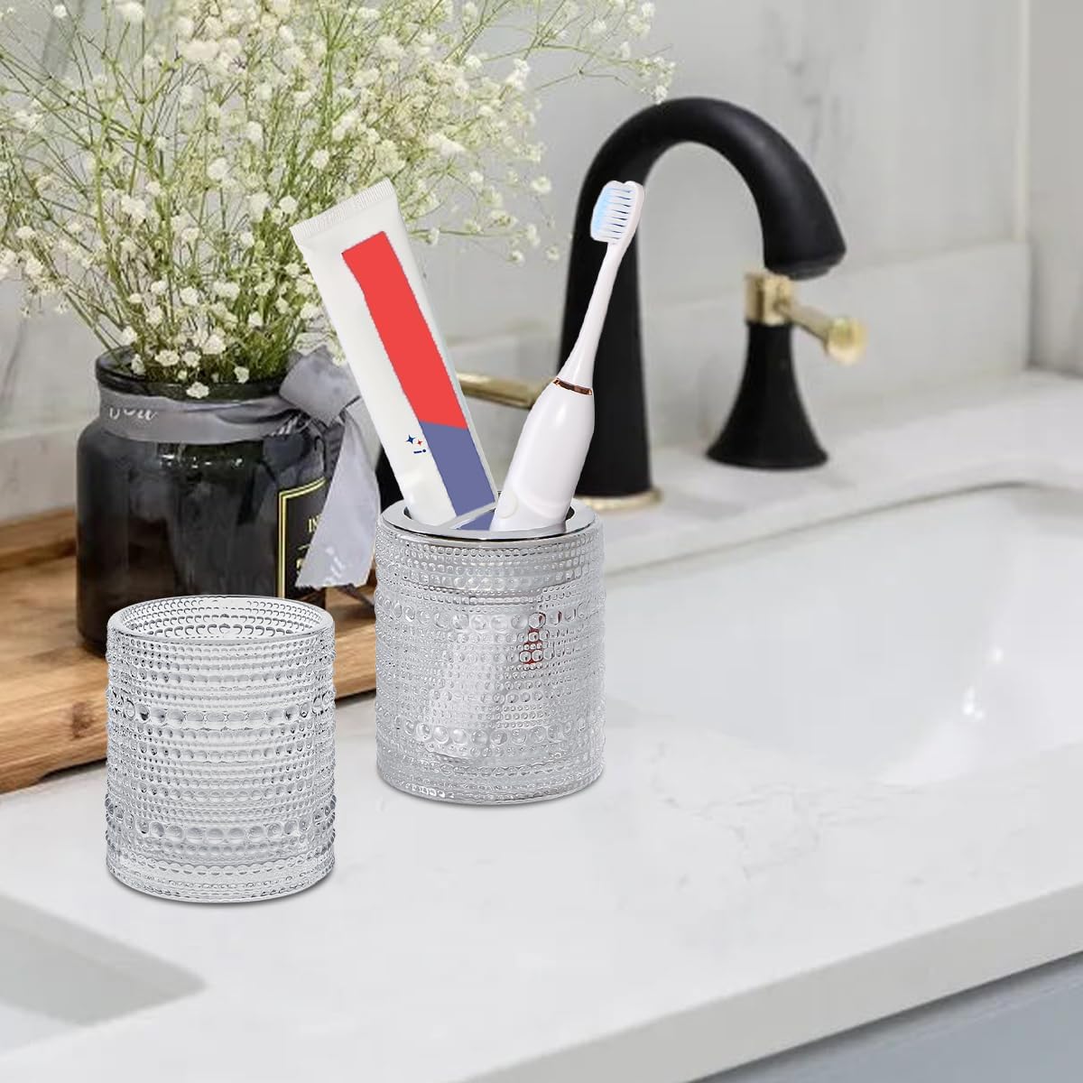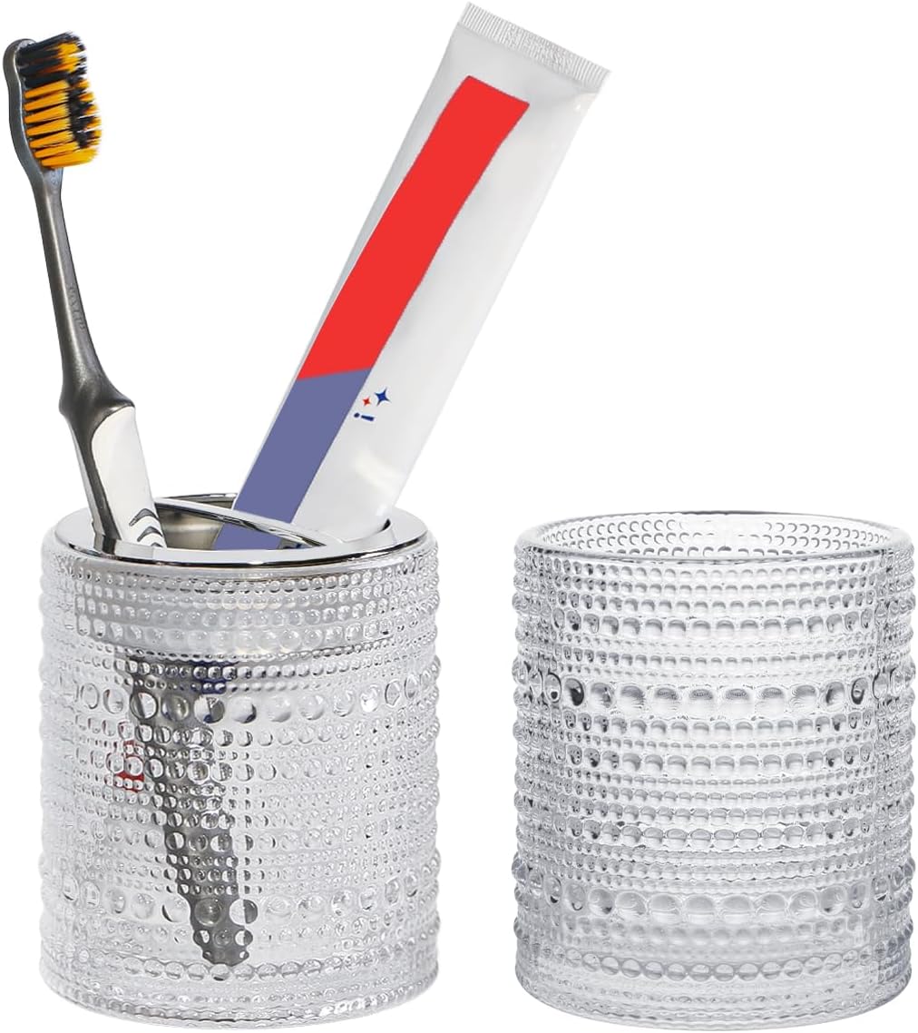 - [ Glass Bathroom Toothbrush Holder Set ] Bathroom toothbrush holder is made of glass,safe for drinking and tooth brushing.toothbrush storage cup with 2 slot,can store toothbrush and toothpaste together,dots design also add tastes the art of life