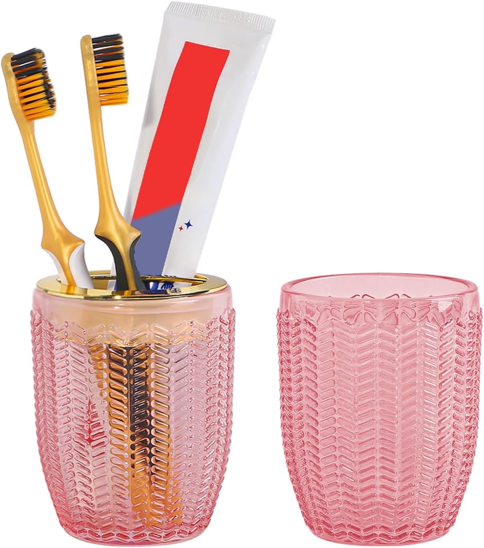 Toothbrush Holders for Bathrooms, Pink Glass Toothbrush Holder with Gold Divider, 10oz Bathroom Tumbler and Mouthwash Cup, Bathroom Storage Cup for Tooth Brush, Toothpaste and Makeup Brush